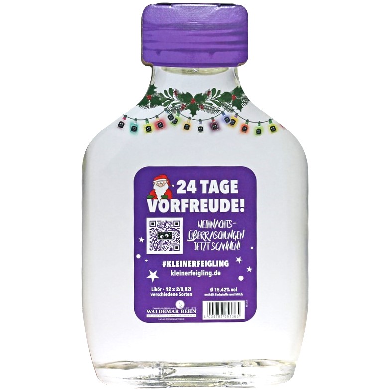 Der Kleiner Feigling Adventskalender 24 x 0,02 L bringt die Weihnachtsvorfreude in Form einer weihnachtlich gestalteten XXL-Flasche. Er enthält 24 Mini-Flaschen, die eine abwechslungsreiche Mischung aus Klassikern und limitierten Likörsorten bieten. Aufklappen und los geht es bei Kleiner Feigling: Jeden Tag im Advent wartet eine kleine Flasche mit fruchtigen und cremigen Aromen – die große Weihnachtsparty kann kommen.